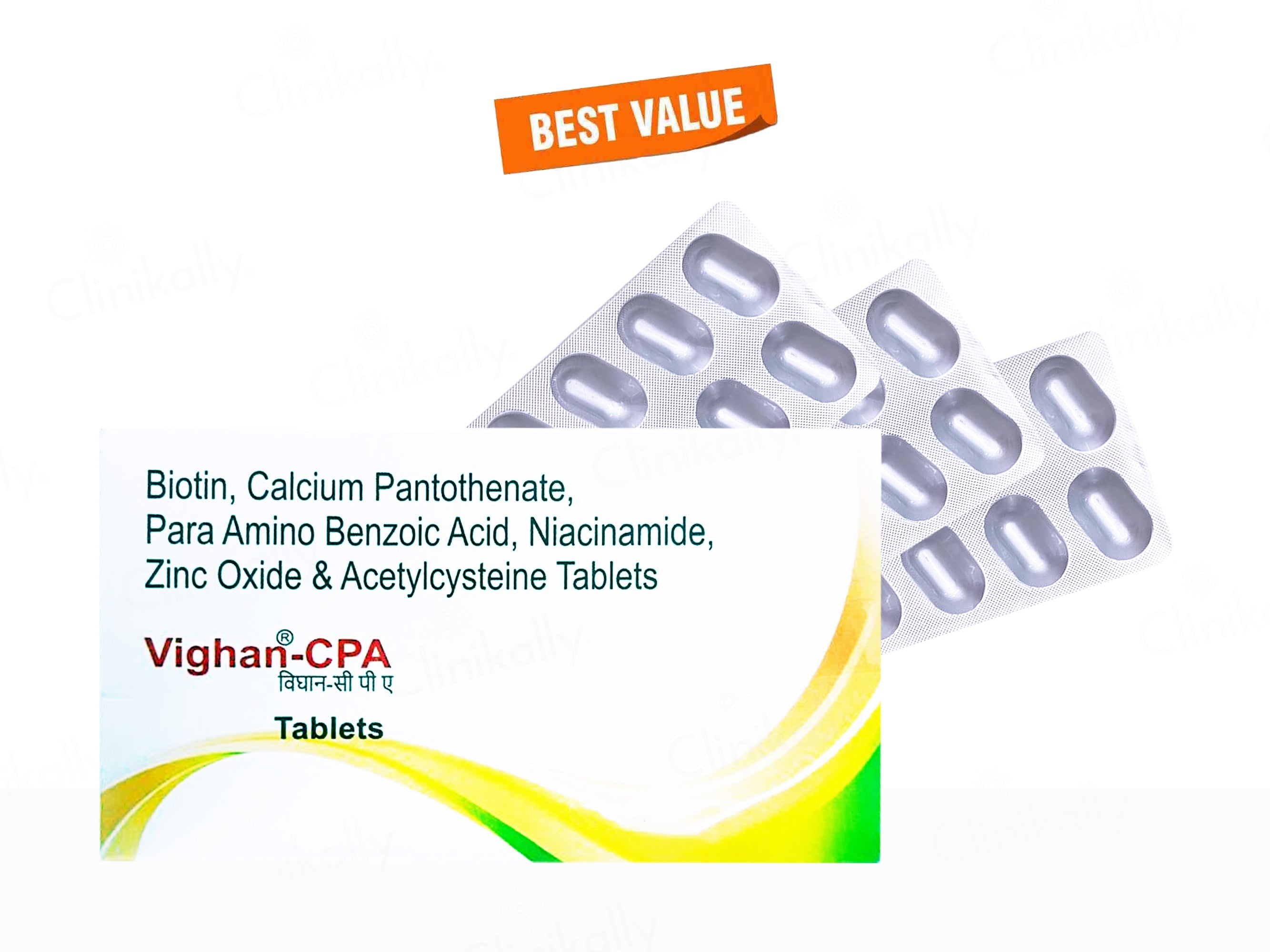Vighan-CPA Tablet is a nutritional supplement designed to support hair health, improve skin vitality, and protect the body against oxidative stress. Enriched with a synergistic blend of Biotin, Calcium Pantothenate, Niacinamide, Zinc Oxide, and Acetylcysteine, it helps strengthen hair roots, reduce hair fall, and boost collagen production. Its antioxidant-rich formula supports overall cellular health and promotes stronger, shinier hair and healthier skin. Ideal for individuals experiencing hair thinning, dull skin, or nutritional deficiencies, Vighan-CPA works from within to restore balance and support wellness.