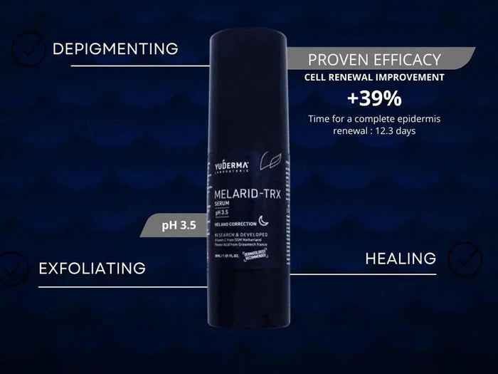 Yuderma Melarid-Trx Melano Correction Serum is a targeted treatment designed to reduce hyperpigmentation, dark spots, and uneven skin tone, promoting a brighter and more even complexion.