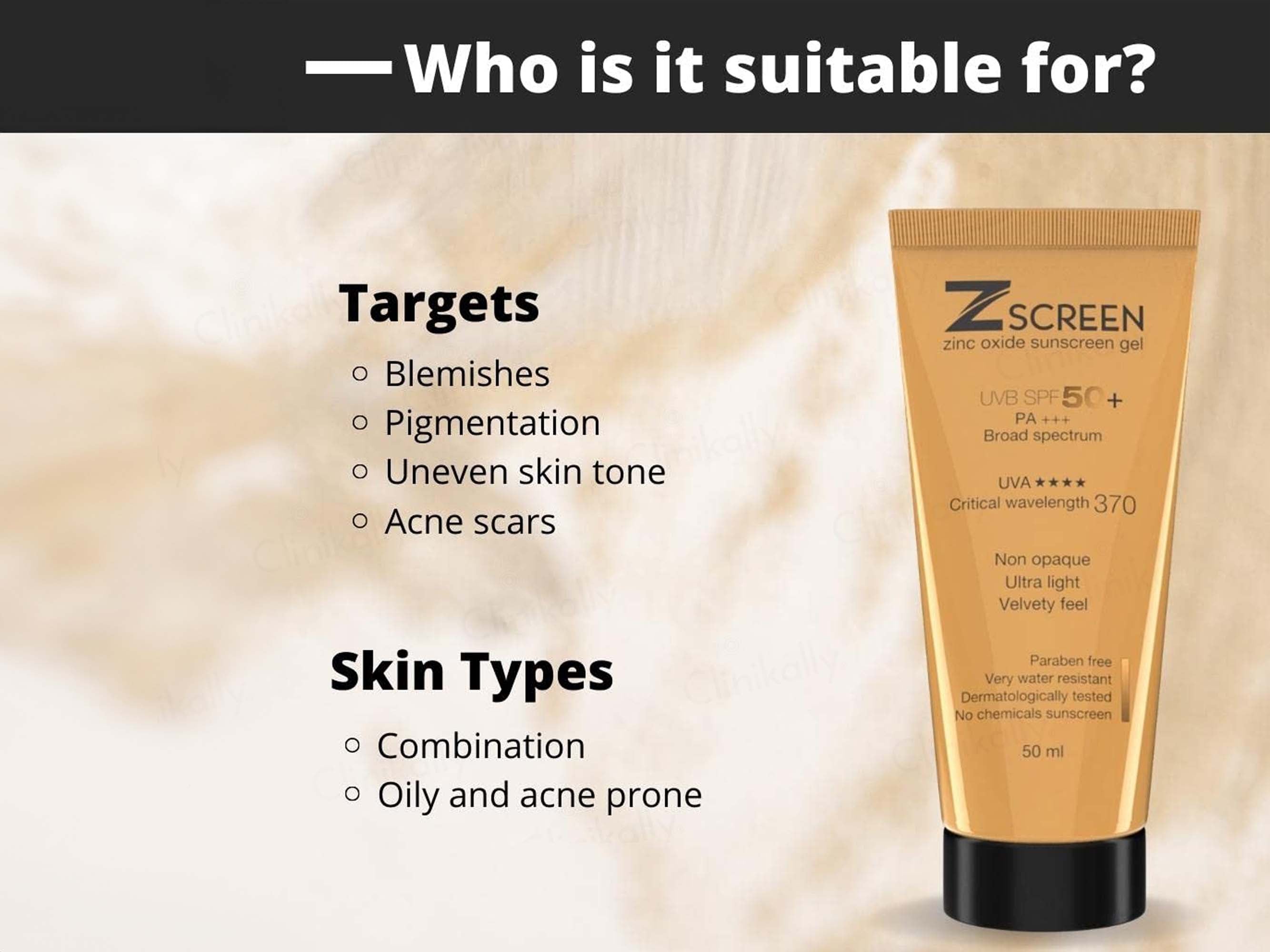 Z Screen Zinc Oxide Sunscreen Gel SPF 50+ PA+++ offers broad-spectrum protection against UVA and UVB rays, utilizing zinc oxide as the primary active ingredient of the sunscreen. This chemical free sunscreen gel is designed to provide a non-greasy, matte finish, making it ideal for daily use on all skin types, including sensitive skin. It is free from parabens, petroleum, and preservatives, ensuring a safe and gentle application that won't clog pores.